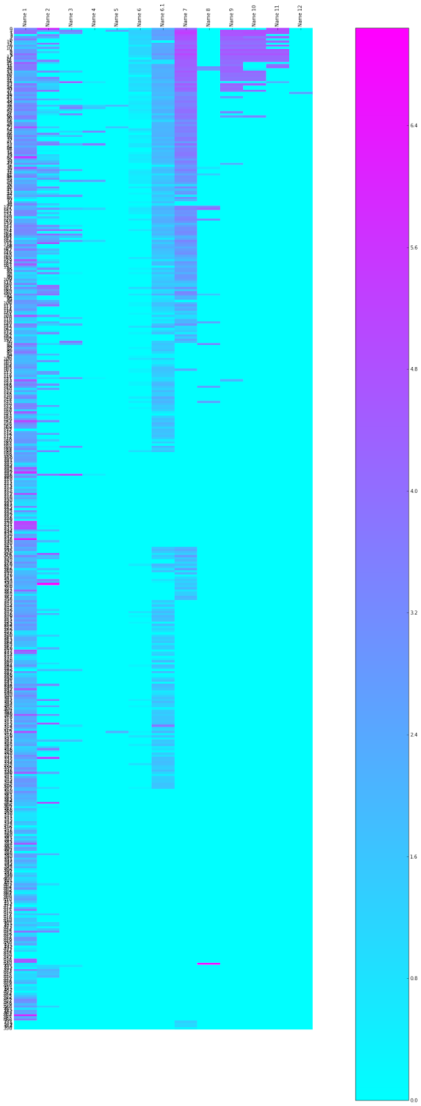 Each row is a distinct kinase inhibitor, each column is a synonym or identifier for that compound. Columns 1 to 5 are research code type names (e.g. UK-92480), with the first column being the one we use as the primary identifier, Column 6 is the InChI key, Column 6.1 is the CAS Registry number, 7 is the USAN/INN 8 is a deprecated USAN/INN or another common trivial name, Columns 9 to 12 are trade names (in case you are wondering, row 12 is of the Chinese tradename of a compound). The cells are coloured by the log(10) of the count of the number of times the name occurs in a google search - pink high, blue low (or there is no synonym of that class for that compounds). There are some false positives, where the name is unusually common, so it matches the name of something unrelated to a kinase inhibitor or therapeutic application.