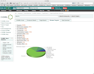 The magic data pixies here at EMBL-EBI have been working hard and we have loaded all the data into the latest release of our SAR database - ChEMBL04. The data is now live in the web interface, and the ftp download of the whole database will be in the near future (we are still optimising our production processes, so sorry that the data is available in the front-end before the download files are fully ready and tested - but we took the view that people would probably not want us to hold back access where possible. However, the gap between loading into the front-end schema and the packaged export release will shorten.